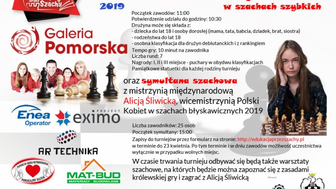 Serdecznie zapraszamy na wielkie wydarzenie szachowe w Bydgoszczy, które odbędzie się 27 kwietnia 2019r. w Galerii Pomorskiej w Bydgoszczy. Odbędą się Drugie Mistrzostwa Rodzinne Galerii Pomorskiej (w godzinach 11.00 – 14.30) a od godziny 15.00 symultana z udziałem mistrzyni międzynarodowej i tegororocznej wicemistrzyni Polski w szachach błyskawicznych – Alicji Śliwickiej! – Link do strony projektowej i zapisów do symultany.