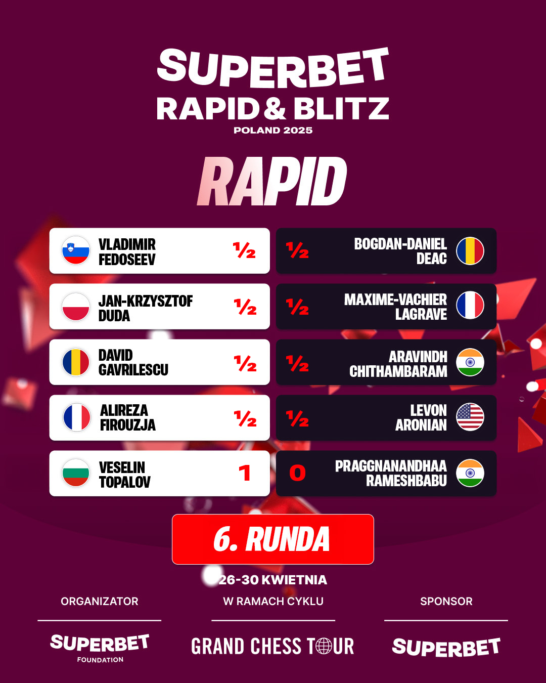 Trzy partie na bardzo wysokim poziomie. Takie krótkie podsumowanie doskonale ujmuje charakter 5 rundy szachów szybkich. Ocena pozycji lawirująca wokół równości charakteryzowała pojedynki Aravindh – Fedoseev, Praggnanandhaa – Aronian oraz Duda – Firouzja. Każdy z nich zakończył się pokojowym rezultatem. Dwie pozostałe partie, tj. Vachier-Lagrave – Gavrilescu oraz Deac – Topalov, to zupełnie inna historia!