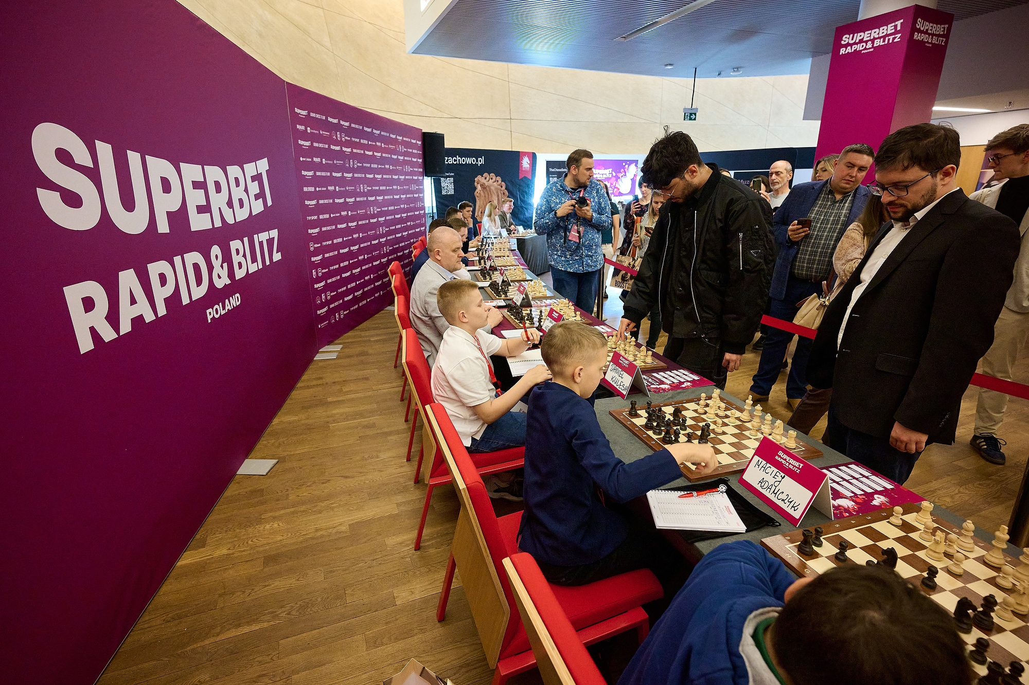 SuperbetGCTWarsaw_0425_fotRafalOleksiewicz_05 Firouzja i MVL udzielają symultany. Fot. Rafał Oleksiewicz