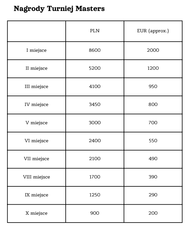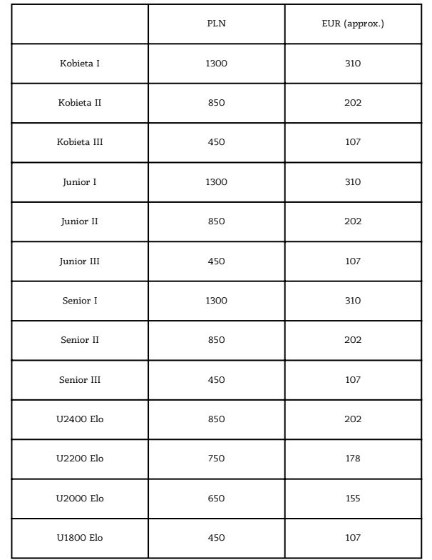 - Zawodnicy urodzeni w i po 2011 roku: 200 zł lub 50 euro