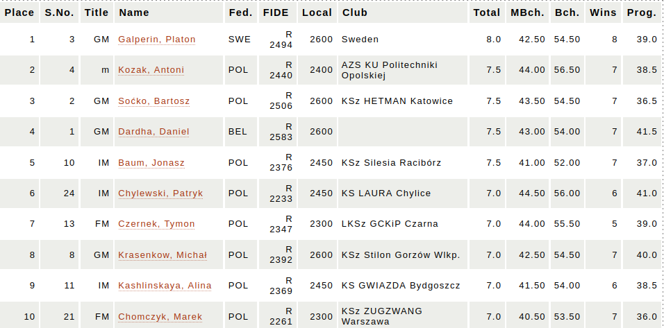 Tuż za zwycięzcą uplasowała się aż czwórka zawodników z wynikiem 7,5/9 punktów. Drugie miejsce zajął mistrz Antoni Kozak (ranking FIDE 2440). Na trzecim miejscu podium stanął GM Bartosz Soćko. Z powodu nieco gorszych punktacji pomocniczych, tuż poza podium wylądowali tacy zawodnicy jak rozstawiony z pierwszym numerem startowym GM Daniel Dardha (Belgia) oraz IM Jonasz Baum.