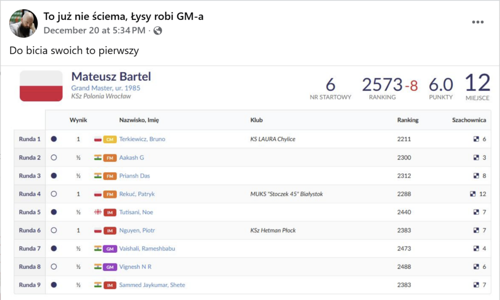 Na koniec myślę, że mogę napisać coś w pierwszej osobie. Od lat narzekam na problemy z promocją turniejów w Polsce. Cieszę się zatem szczególnie, że mamy nowy porządny festiwal, na którym można spotkać silnych graczy i zdobywać normy na tytuły międzynarodowe. Osobiście turniej przypadł mi bardzo do gustu i chociaż ostatnio nie mam za bardzo czasu na trening i grę, to z wielką przyjemnością wziąłem udział w tym wydarzeniu. Zająłem 27 miejsce i udało się nie stracić na rankingu. A nie było to proste po dużej wpadce w pierwszej rundzie.