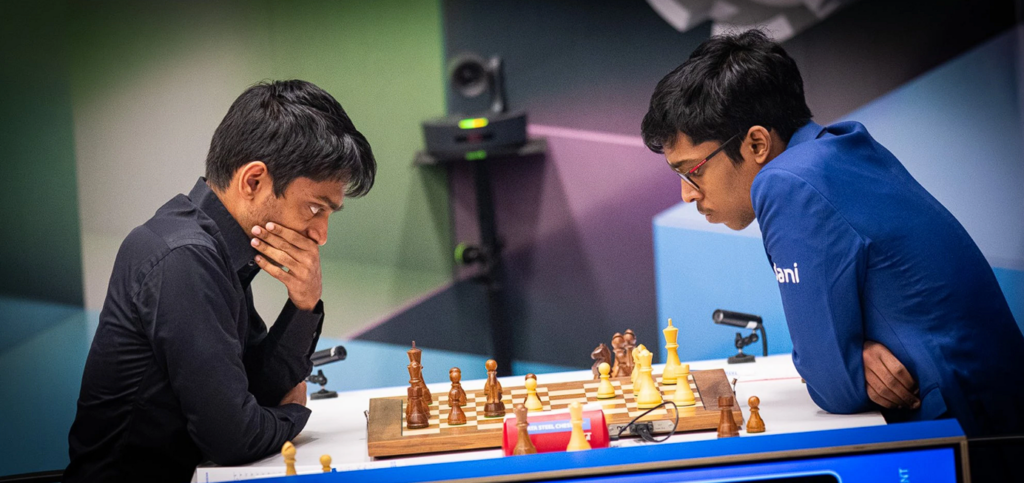 Partia między dwoma przyjaciółmi, którzy od maleńkości razem trenowali i rozwijali się – Praggnanandhaa kontra Aravindh. Partia może być traktowana za poprawną i wręcz nudną. Pierwszy znaczący przechył silnika był dopiero w 50. posunięciu, już na etapie wieżówki. Uważam jednak to za ważną partię dla Pragga. W ostatnich miesiącach nie zachwycał (tylko 6/11 w Grand Swiss, męki z Kuybokarovem w dogrywkach 2 rundy Pucharu Świata, które wygrał, by później przegrać w dogrywkach rundy 4 z Dubovem), a spodziewać się można, że sporo ważnych punktów na Cyprze do zdobycia będzie właśnie w długich i nudnych końcówkach.